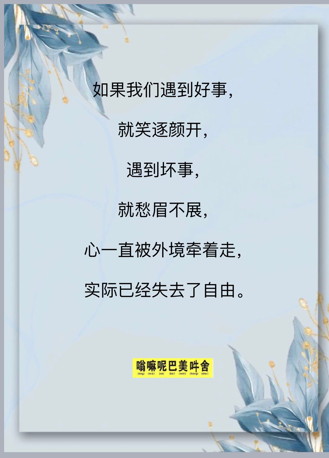 如果我们遇到好事,就笑逐颜开,遇到坏事,就愁眉不展,心一直被外境牵着走。实际已经失去了自由。