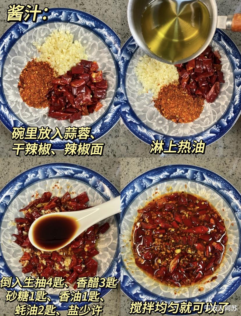 接下来就是制作灵魂酱汁了。取一个干净的碗,放入切好的蒜蓉、干辣椒段和辣椒面。蒜蓉的用量可以根据个人口味适当调整,喜欢蒜香味的可以多放一些。然后,将烧热的食用油淋在蒜蓉和辣椒上,激发出它们的香味,瞬间,浓郁的蒜香和辣椒的辛香便会扑鼻而来。接着,依次加入四勺生抽、三勺香醋、一勺砂糖、一勺香油、两勺蚝油和少许盐,用勺子充分搅拌均匀,这样一碗香辣开胃的酱汁就做好了。