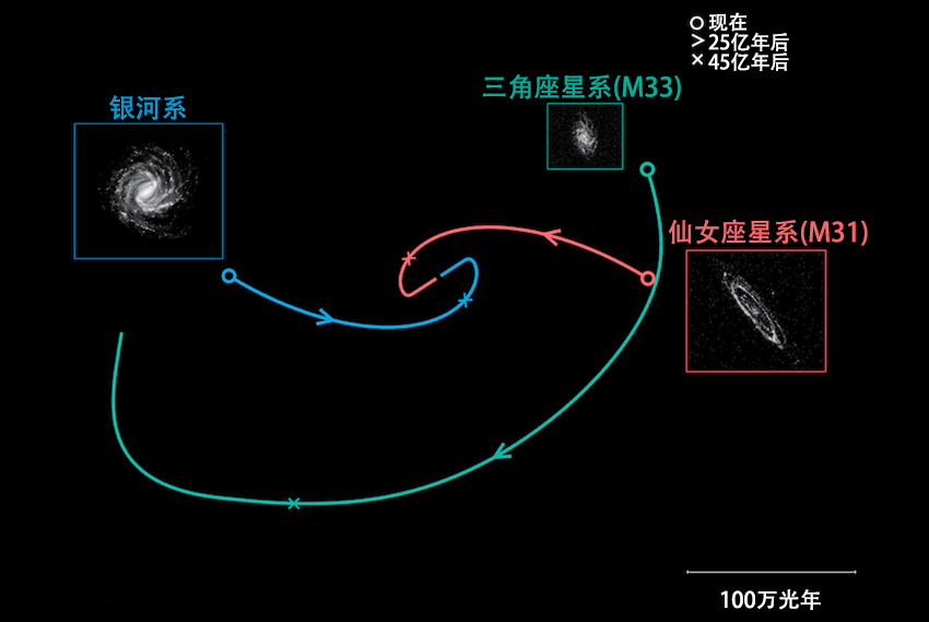 同样地,银河系作为一个整体结构,也在宇宙中转动。银河系与附近至少80个星系组成了本星系群,直径达1000万光年。银河系与其他星系绕着本星系群的质心在转动,速度约为每小时44万公里。但银河系会与本星系群中的仙女座星系螺旋靠近,在几十亿年后发生碰撞,并融合成一个更大的星系。