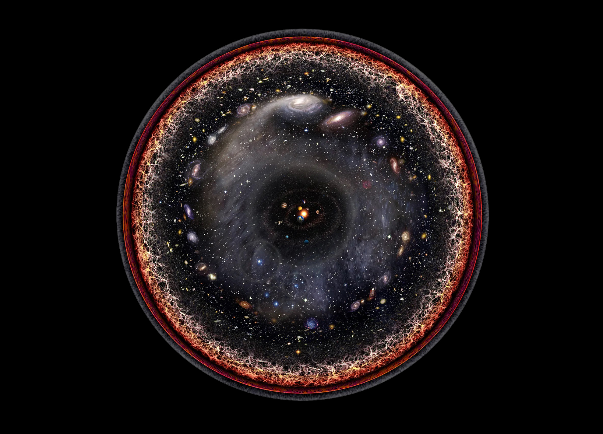 如果把时间向前回溯,宇宙空间会变得越来越小,星系之间也变得越来越靠近。直到回溯到某一时刻,整个宇宙缩小到一个无限小的奇点,所有宇宙物质全部聚集在一起,这一时刻就被认为是宇宙的时间起点,距今约138亿年。宇宙就是从奇点大爆炸中诞生,随后不断膨胀变大。