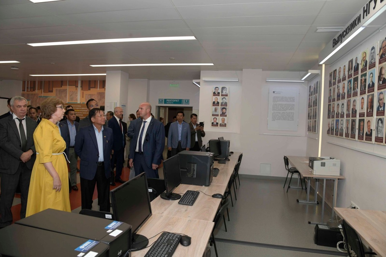 接下来敏昂莱大将和代表团成员参观了新西伯利亚国立大学,受到了校长米哈伊尔·彼得罗维奇·费多鲁克和官员的欢迎,敏昂莱大将提取了有关学科科学和技术研究展位的简报,关于化学、物理学、应用数学、信息技术、动物学和地质学的发现,并围绕实验室、研究室和报告厅进行了现代技术对未来世界的预测,敏昂莱大将了解更多信息并进行了讨论。