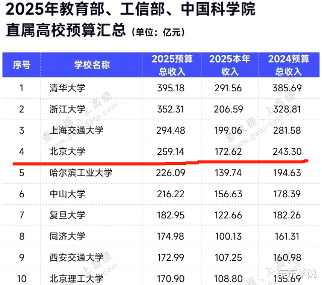 在前五高校中,有四所是传统的工科高校,仅有北大是文理综合高校;说明工科高校建设是未来的主方向。不过北大2025年经费预算仅有259亿元,虽比2024年有增长,但是掉到了第4名;比同是top2高校的清华,少了135亿元。
