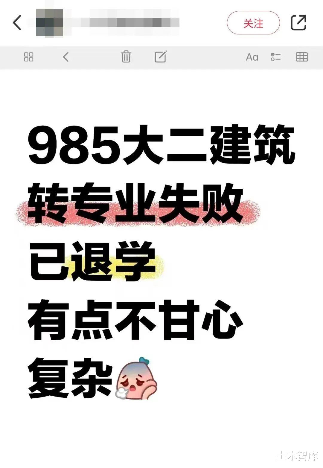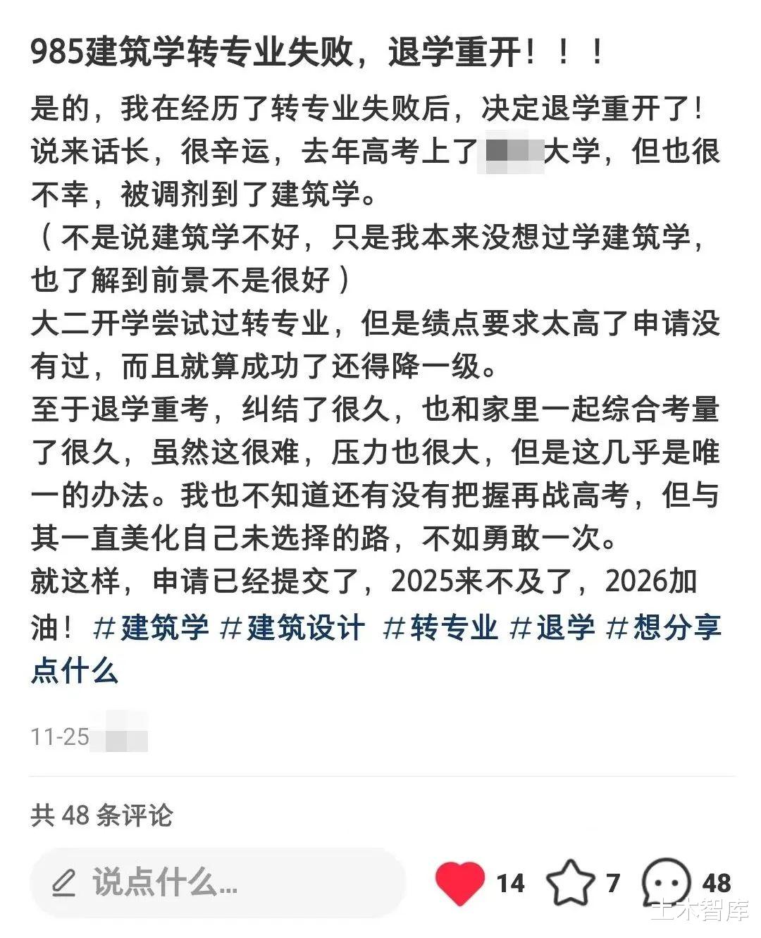 从这名学生的发帖内容来就看,去年高考他被录取到某985院校,但因为分数的原因被调剂到建筑学专业。目前已经读到大二,却因转专业失败选择退学重考。