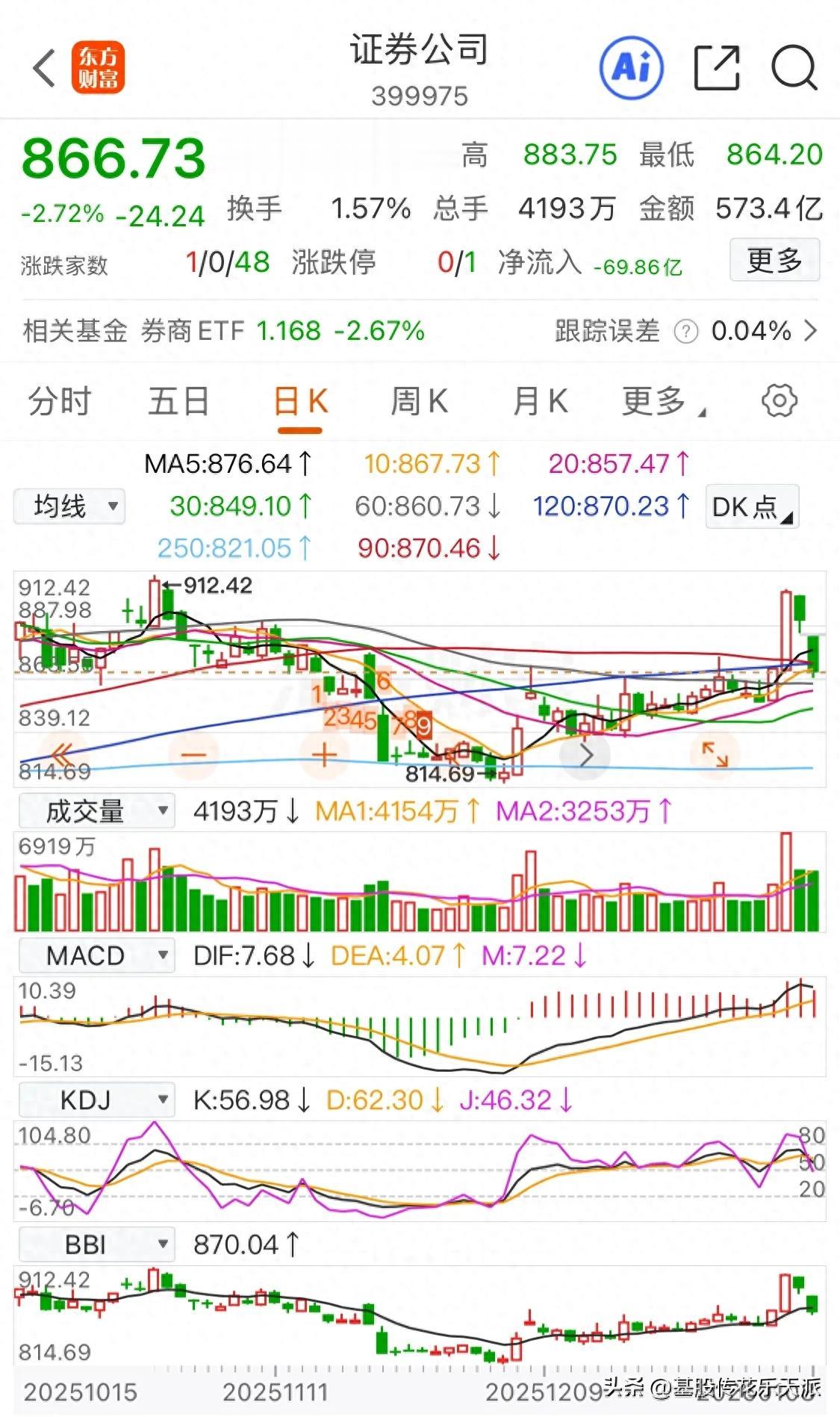 从MACD指标出发,去分析接下来的走势,重点可留意“DIF”穿越0轴线之后的动态,围绕0轴线将会出现不同程度的徘徊震荡,然后才是远离。所以,只要能保持在0轴线上方,就可以证明券商板块的调整是在“蓄势”。