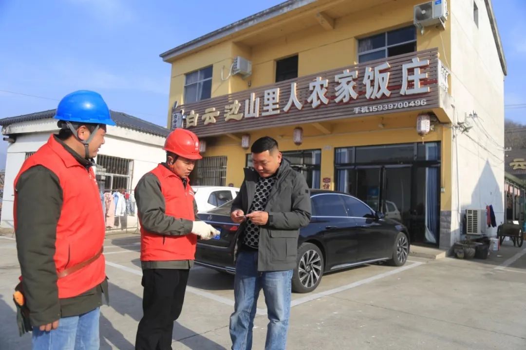 在泗店乡“山里人”农家饭庄,严会平一行人义务为其排查用电隐患,讲解安全用电知识以及节能小技巧;送上了供电服务“连心卡”,确保能够及时帮助用户解决用电问题。