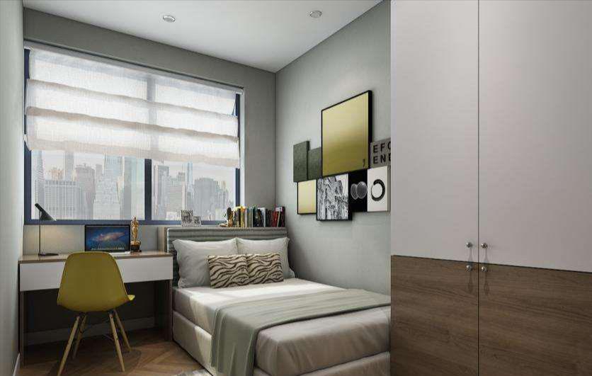 这种属于更小面积的卧室,预计6-8平米左右,只能放下单人儿童床,那么就临窗放置书桌+单人床,采光一级棒,衣柜如果放不下都可以做成吊柜用来节省空间。