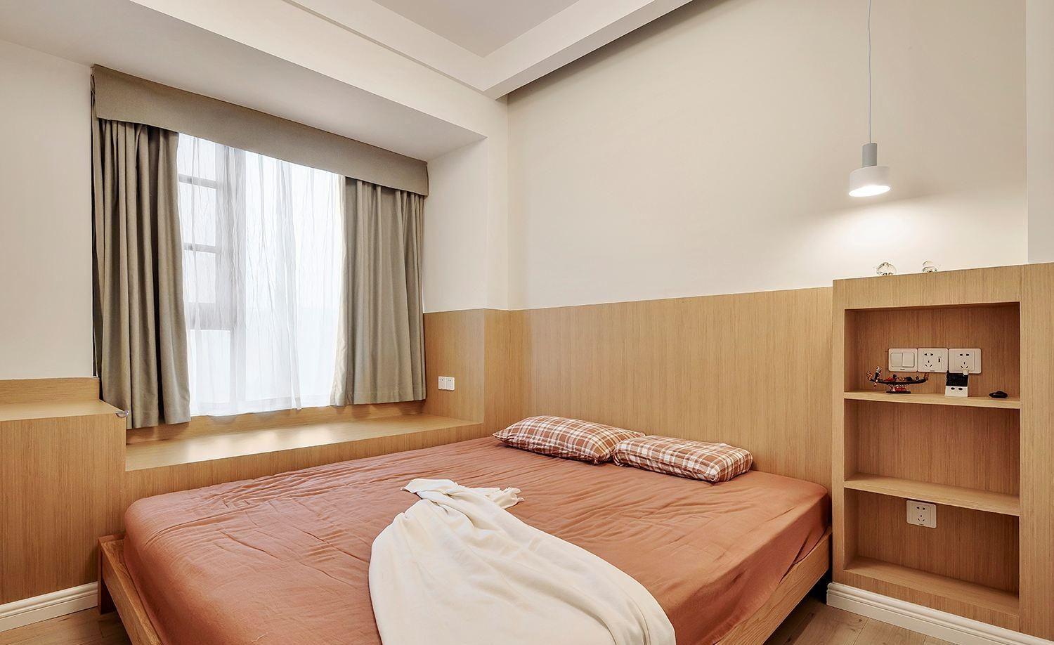 墙面一圈木质护墙板连接到飘窗部分,小空间看起来更有整体性,右侧做了木质壁龛代替床头柜。平板床和整个日式原木风格更搭配。