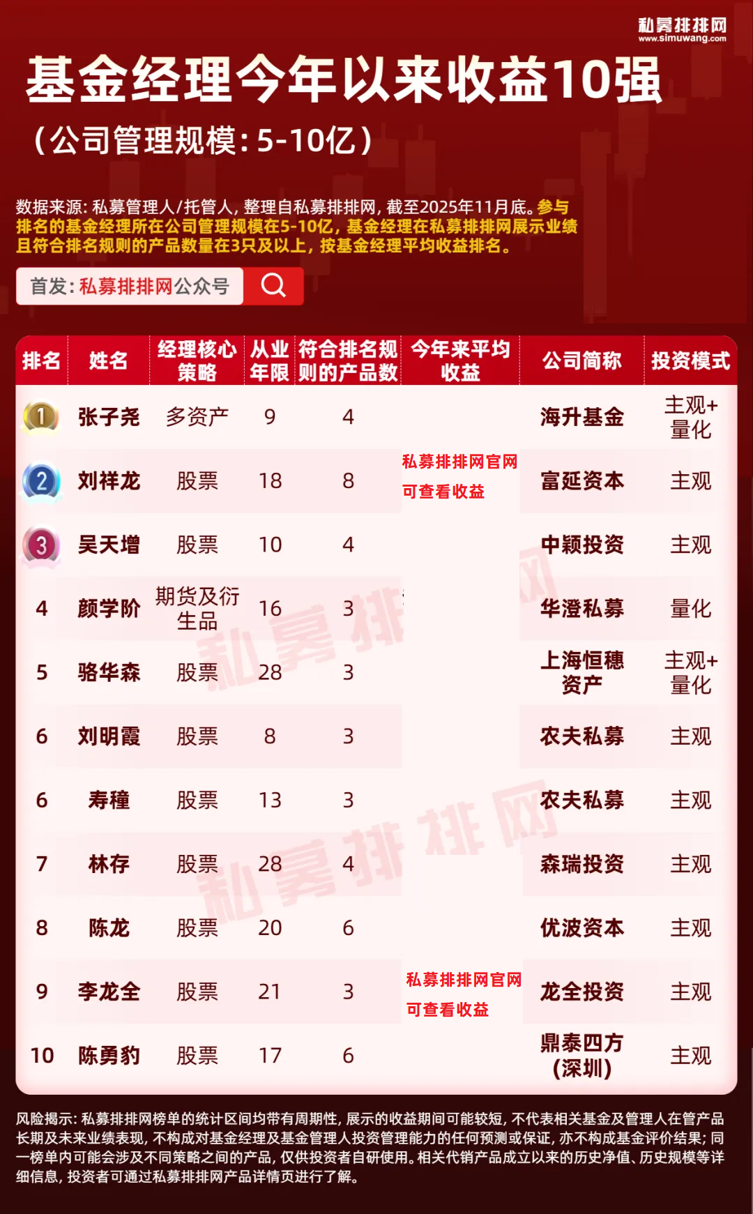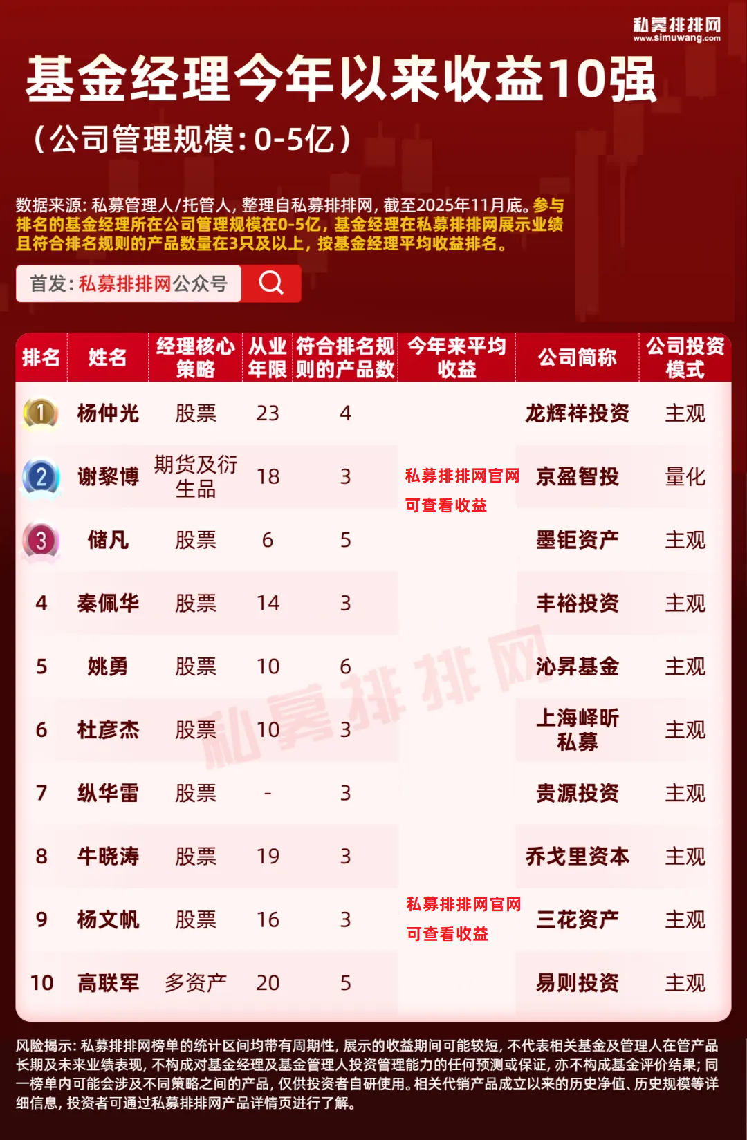 为了给读者提供更多的信息,笔者将分别在以上六个规模区间的私募中,为大家盘点今年1-11月收益位列10强的私募基金经理。