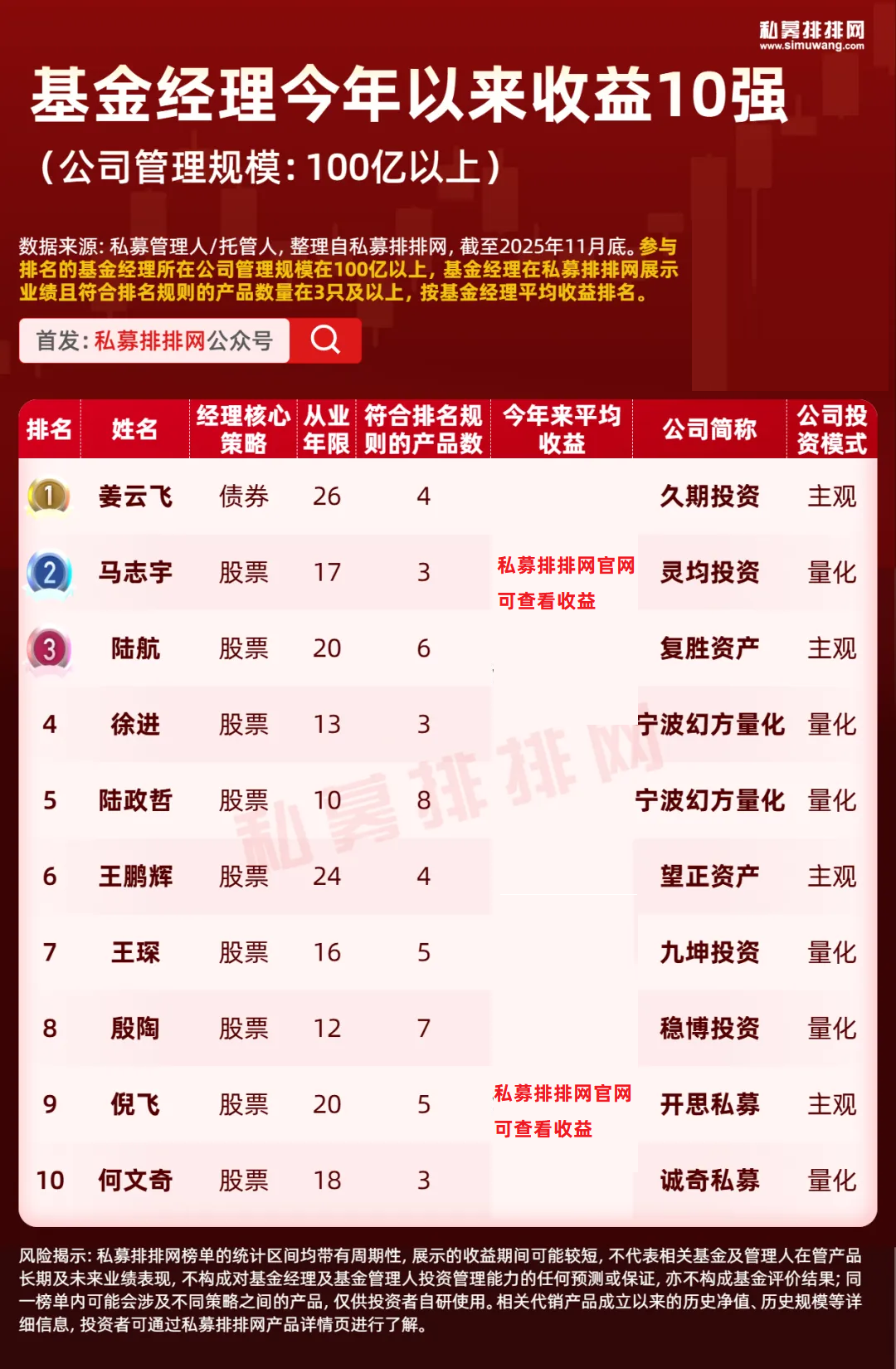 进入12月,私募基金经理的年度收益排名也进入了最终冲刺阶段。今年1-11月,所管产品至少有3只符合排名规则的私募基金经理