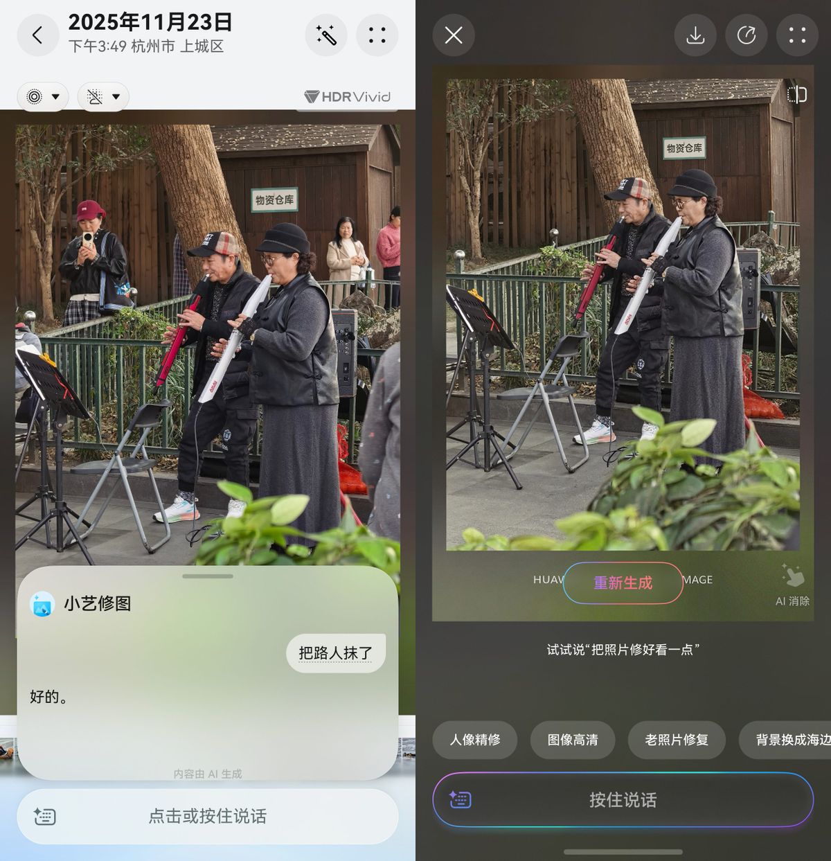 伴随旅行的一大重要任务,必须是出片!这期播客自然还聊到了修图,我现在也是离不开小艺修图智能体。老蒋说的AI消除功能,我用得比他还频繁:照片里乌泱泱的路人,直接对小艺说"把路人抹了",它不仅消得干净,还会自动补全背景,纹理效果比我手动P半天还强。还有换背景、换衣服颜色、P个猫等超多玩法,给非专业创作者但又想给生活增添更多乐趣的人来说,可以说相当实用。