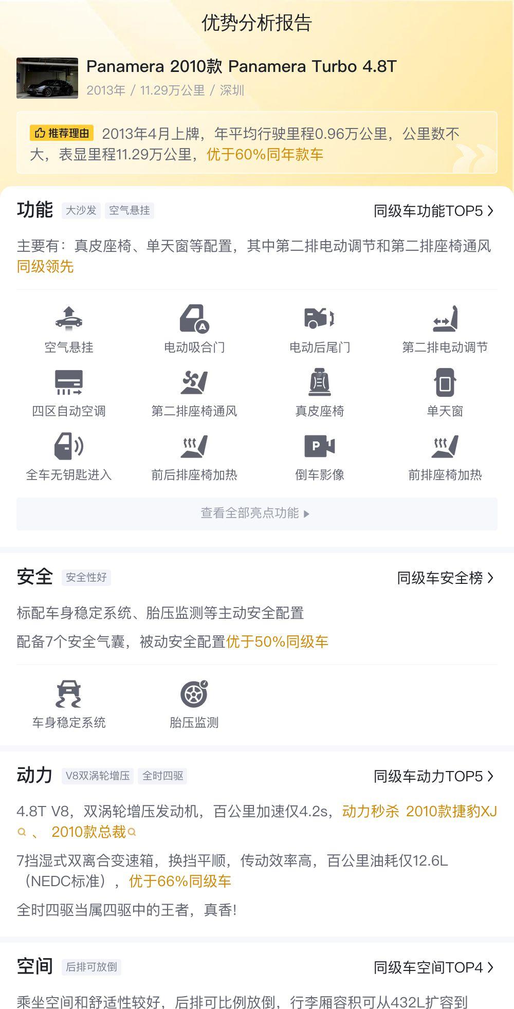 最后,我们来总结一下这辆二手保时捷Panamera Turbo的优缺点。优点:品牌知名度高,性能强劲,配置丰富,空间宽敞,价格相对较低。缺点:车龄较老,里程数较高,车况存在不确定性,后期维护保养成本可能较高。