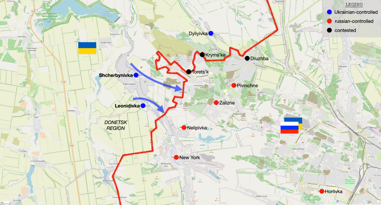 托列茨克方向,乌军昨日收复了更多的失土和阵地,两个郊区村镇Shcherbynivka和Leonidivka被一口气拿回。