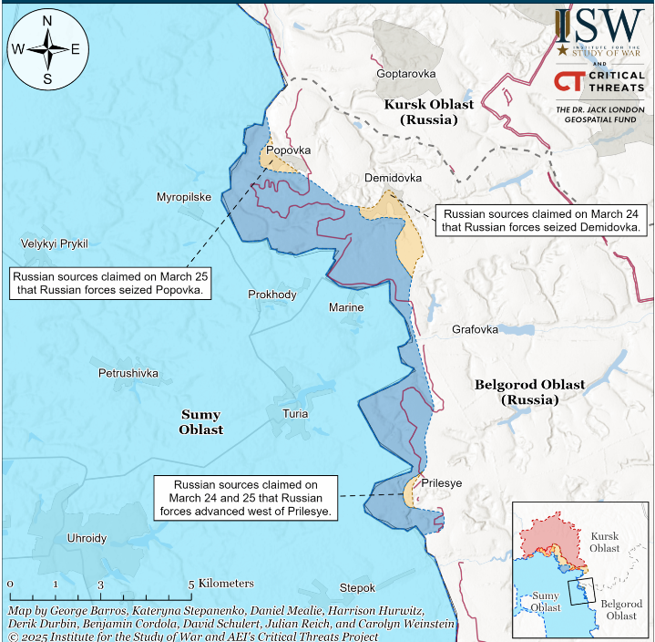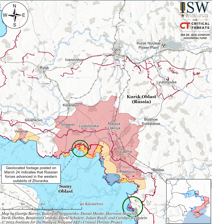 过去24小时,俄罗斯军队继续在库尔斯克-苏梅t边境地区推进。最新的地理定位视频显示,俄军已经抵达了茹拉夫卡(苏梅州)西部郊区。