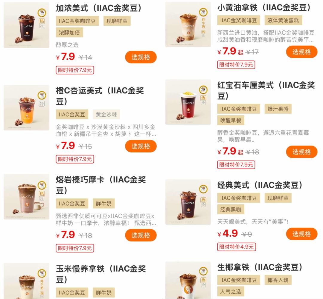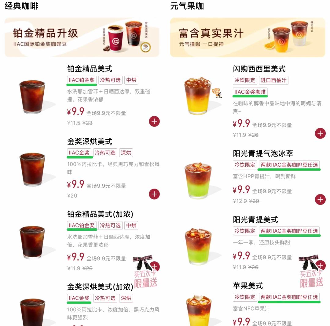 到现在,瑞幸已连续7年获得IIAC金奖,并将这一奖项作为核心卖点,在美式家族、生椰家族、大师咖啡、风味拿铁等系列饮品中都有IIAC金奖或IIAC金奖豆的标识,部分咖啡产品更支持咖啡豆自选,消费者可按需选择获奖认证豆或其他品类。