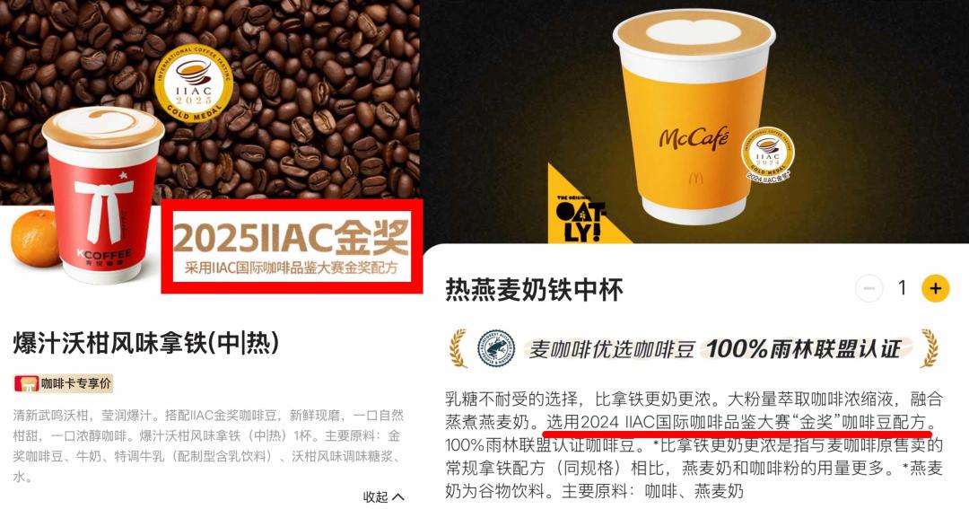 肯德基、麦当劳两大快餐巨头的咖啡饮品也纷纷标注IIAC金奖认证。其中肯德基甄选奶咖系列采用的是2025年IIAC金奖咖啡豆,麦当劳的燕麦拿铁、卡布奇诺等则选用2024年IIAC金奖咖啡豆配方。