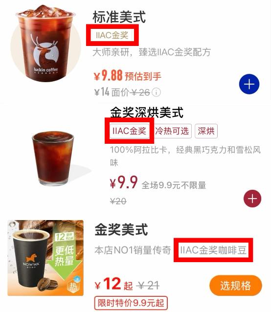 随便点开一家咖啡的点单小程序,“IIAC金奖”的标识几乎随处可见,瑞幸、库迪、挪瓦咖啡等连锁品牌的咖啡都已纷纷用上这一标签,作为自家咖啡的宣传亮点。