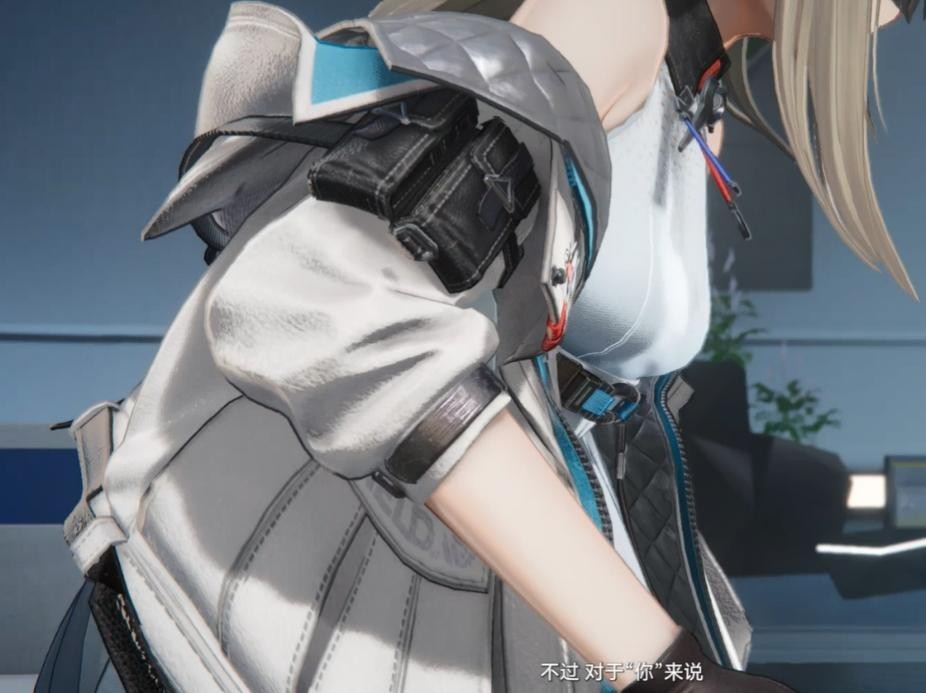 于是所有精细的材质处理以全身的形式向我们展示的时候,突然就觉得方舟风格的一大堆带子口袋没有那么多余了。佩丽卡的内衬面料像是氨纶针织,在很多科幻设定里表现专业作业服饰和贴身衣物的舒适感,可以看到只有微微的反光和细密的针脚;外套是尼龙复合面料,有种毛毛的,略显粗糙的感觉,即使这种偏粗糙的面料也阻止不了鹰角把细腻的纹理和褶皱表现出来的效果,再看一眼胳膊上挂着磨损到发白的皮革包包,和外套内衬一搭配的材质效果只能说无敌。