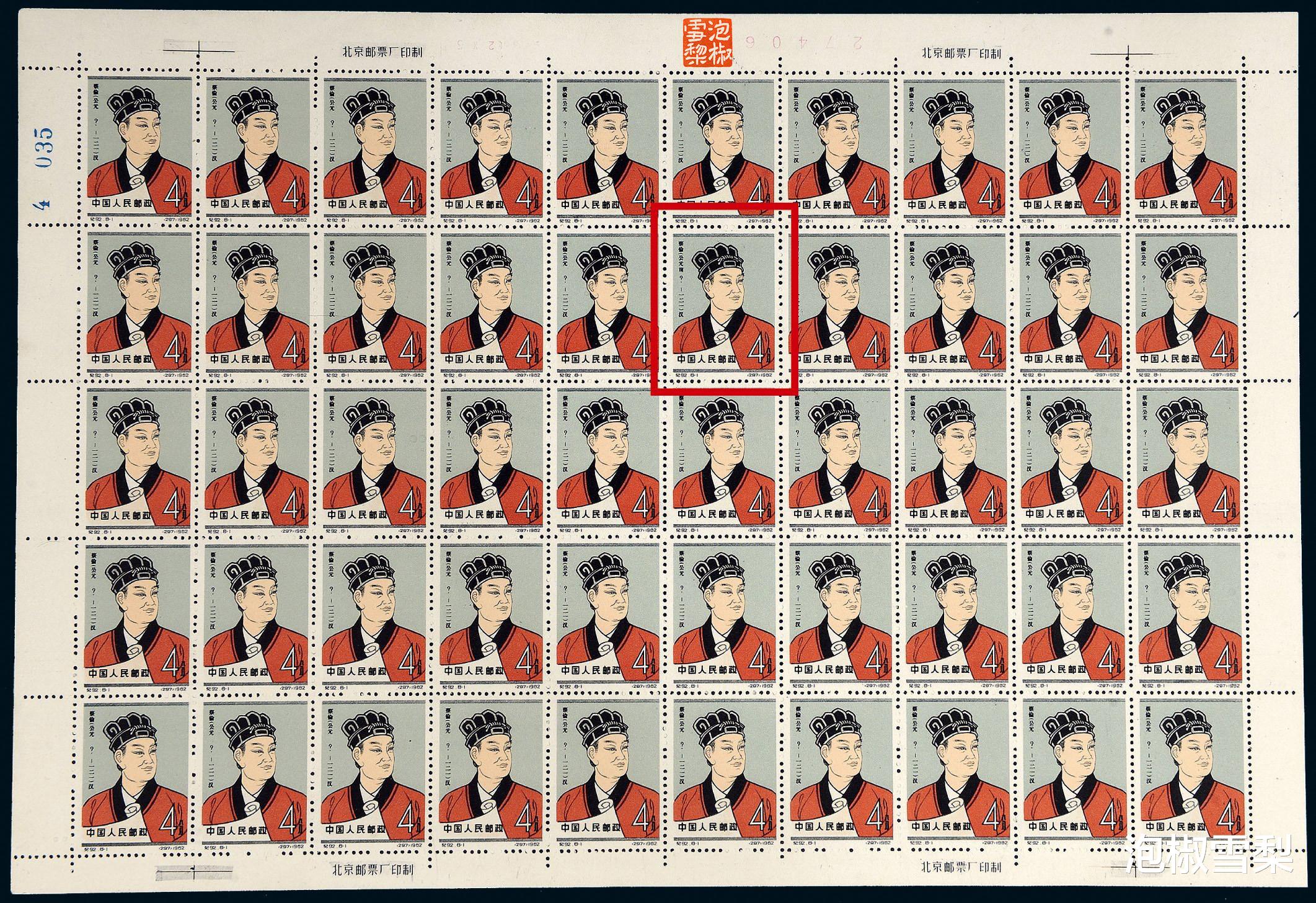 史料上明确记载,蔡伦的辞世时间为公元121年,北京邮票厂当年的报告显示,1962年6月印筒制作完后,由于赶印梅兰芳邮票而推迟,1962年9月发行局通知北京邮票厂去掉“前”字,为减少损失,邮票厂将作好印筒上的“前”字逐个涂掉,由于操作和检查人员均出现疏忽,所以整版50枚邮票中出现了一枚“公元前”错版。