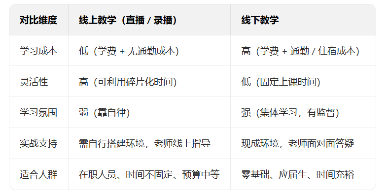 缺点:价格最高(1.5 万 - 2.5 万),时间固定,需脱产或就近上课,通勤成本高;