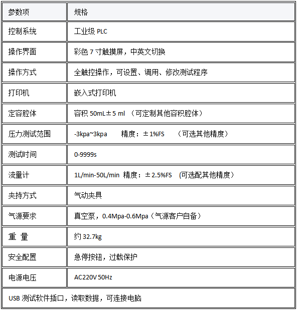 2. 参数设定:在触摸屏上设定测试项目(气密性/通气阻力)、测试压力、流量、时间阈值等参数。