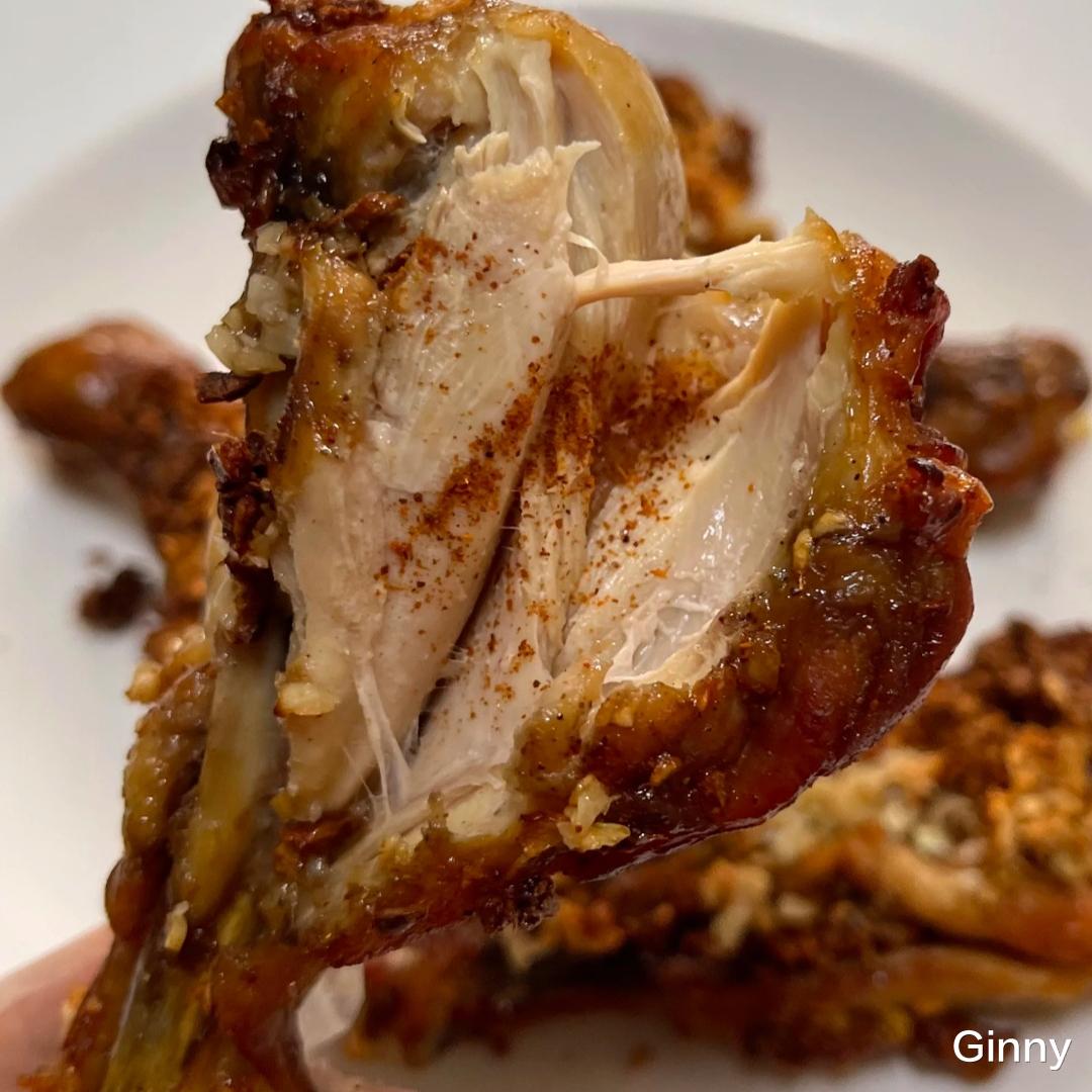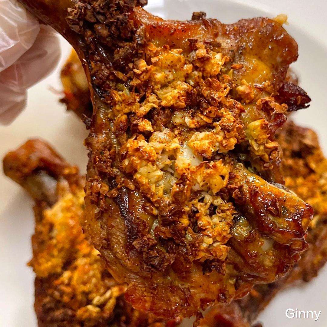 - 将蒜水倒入鸡腿中,加入生抽、蚝油、黑胡椒粉和五香粉,腌制至少30分钟。
