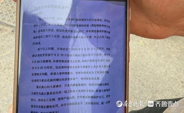 商户向记者出示了关于该市场闭市的通知。通知中称:市场决定于2025年5月20日正式闭市,并且自5月15日起,商户只能出货,禁止进货,摊位需在5月20日前完成清场,逾期未清场的物品将按无主物品处理。