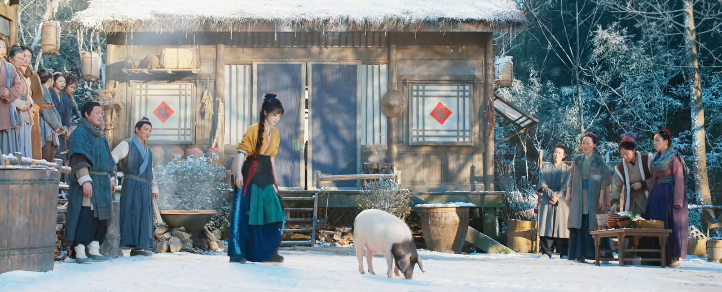 院落中,两三个男子正在追逐一只大肥猪,奈何根本按不住。