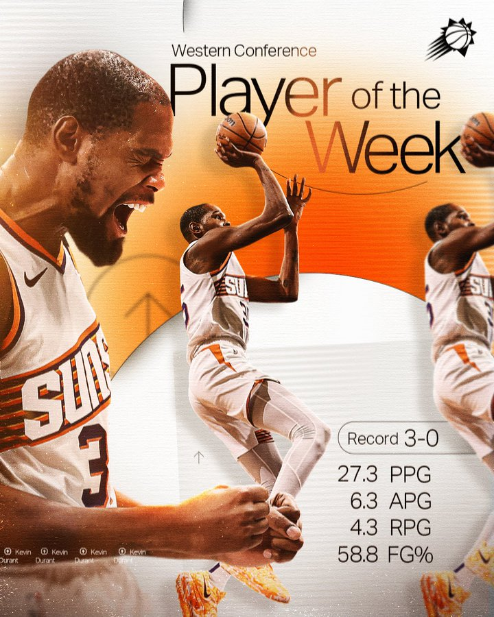 杜兰特上周场均贡献27.3分4.3篮板6.3助攻,投篮命中率58.8%,三分命中率47.1%,罚球命中率93.3%,率领太阳取得3胜0负的战绩。太阳在上周分别战胜了猛龙、公牛和骑士。
