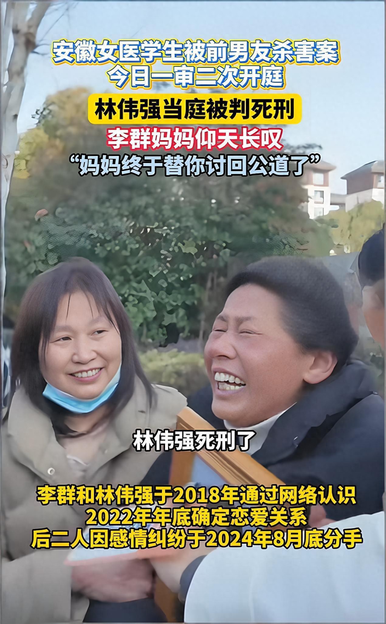 “我不要赔偿,只要他偿命!” 2026 年 1 月 13 日,安徽安庆市中级人民法院的宣判席外,李群的母亲戴着助听器,声音嘶哑却字字泣血。当法官宣读凶手林伟强因故意杀人罪被判处死刑时,这位身患鼻咽癌的母亲,终于忍不住蹲在地上失声痛哭。可让人齿冷的是,当庭的林伟强不仅没有半分悔意,还厚着脸皮提起上诉,甚至扬言 “出狱后照顾二老”—— 这番话,被痛失爱女的李家父母骂作 “这辈子听过最恶心的谎言”。