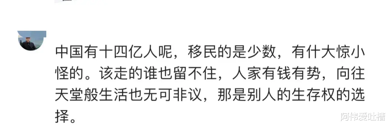 还有网友说:中国有十四亿人呢,移民的是少数,有什大惊小怪的。该走的谁也留不住,人家有钱有势,向往天堂般生活也无可非议,那是别人的生存权的选择。