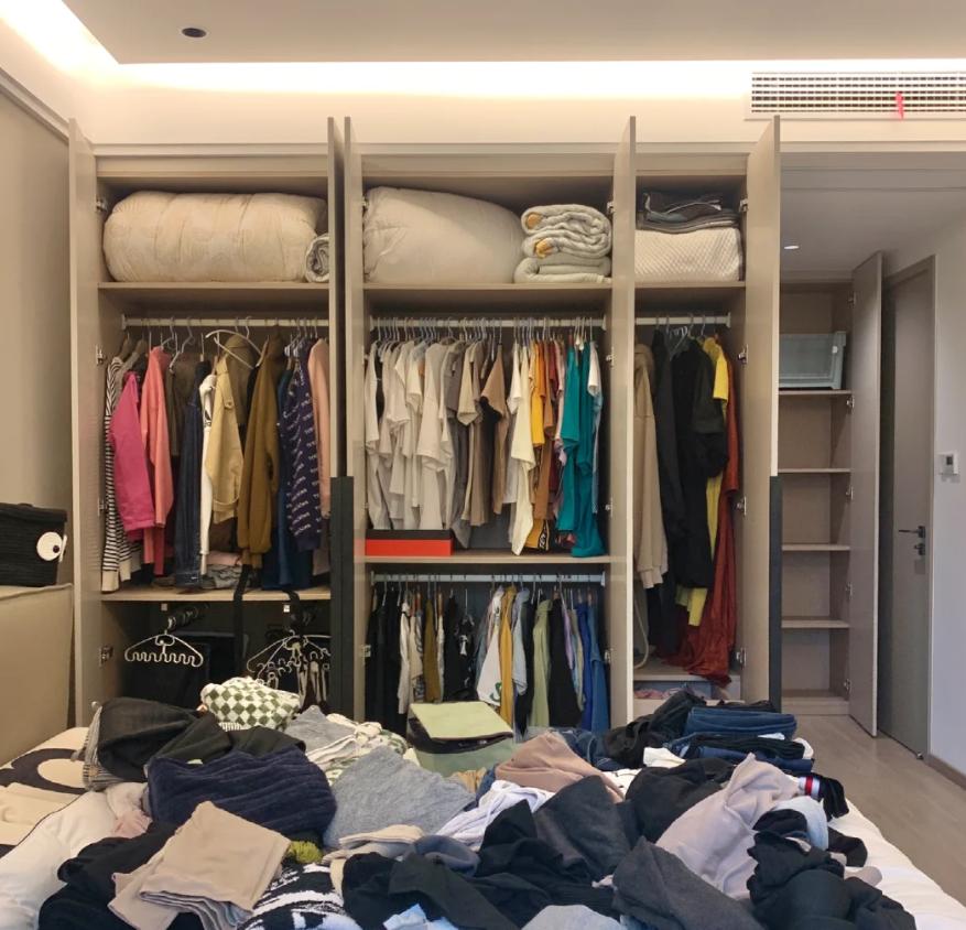 无论衣柜是否一门到顶,其最上层的收纳区通常都用于放置被子等物品。如果被子未进行固定压缩处理,打开柜门时可能会因被子自然膨胀而变得凌乱不堪,甚至导致柜门无法关闭。此外,日常打扫卫生时,由于柜门底部与地面之间的缝隙较小(通常只有1厘米左右),容易将灰尘扫入缝隙中,且拖地时容易弄脏柜门。