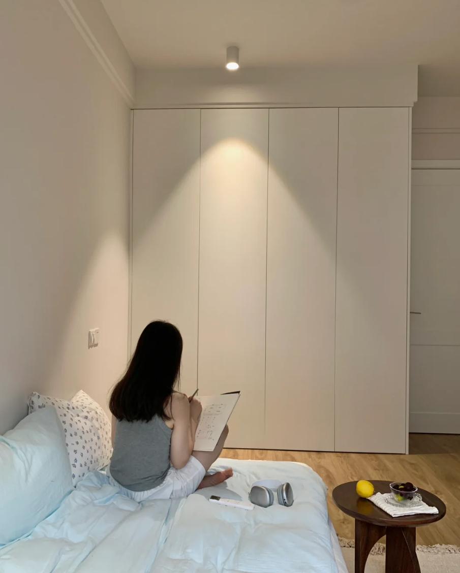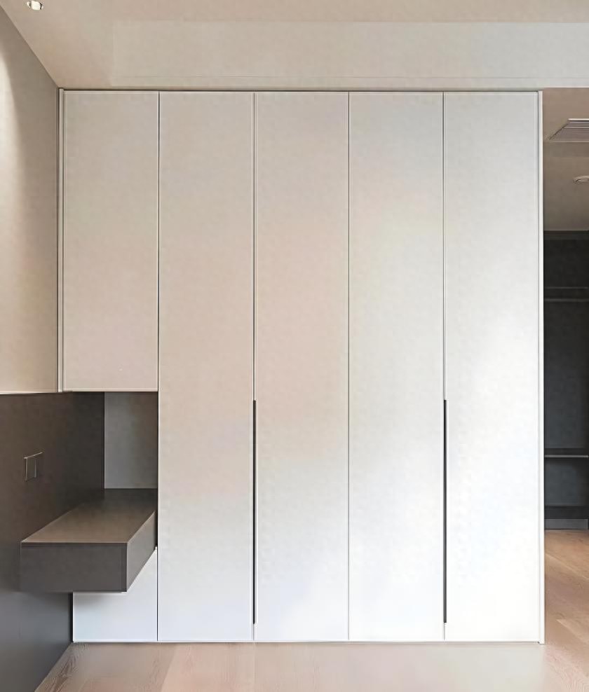 一门到顶的衣柜设计,其最直接的视觉效果便是减少了横向的门板缝隙,仅留下少量的纵向缝隙。若再搭配上隐形式拉手,衣柜与墙体之间的界限将更加模糊,从而营造出一种更为统一和谐的空间氛围,让整体设计显得更为高级与大气。