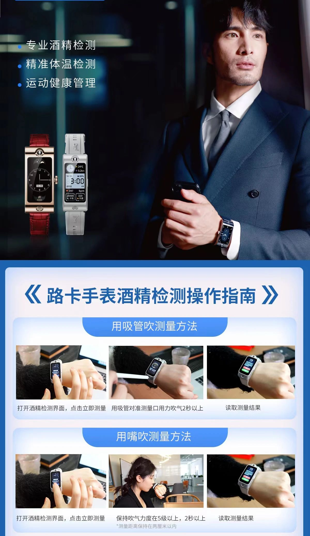 路卡手表集时尚与科技于一身,外观设计简约大气,表带舒适贴合手腕。采用先进的酒精传感器技术,能够精准快速地检测出人体血液中的酒精含量。当佩戴者饮酒后,只需轻轻抬手,对着手表吹气,就能快速给出检测结果。