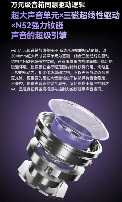 硬件层面,耳机内置20×8mm超大尺寸发声单元,搭配三磁超线性驱动结构与N52等级强力钕磁,大幅提升声压与动态余量,确保在大音量下音质依然稳定、不失控。