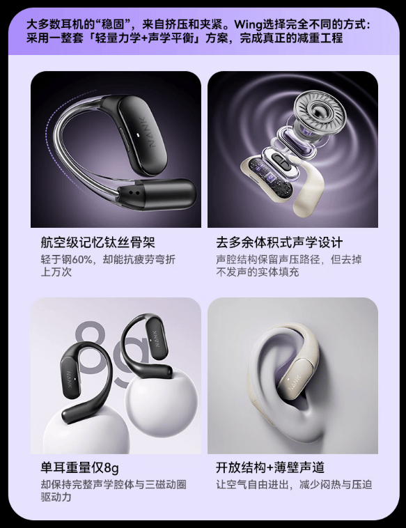 佩戴舒适度是衡量开放式耳机的首要标准。南卡OE Wing采用了 AirWing超轻量机身设计,单耳重量仅约8克,结合零压开放式结构,实现轻、透、稳的佩戴感受。