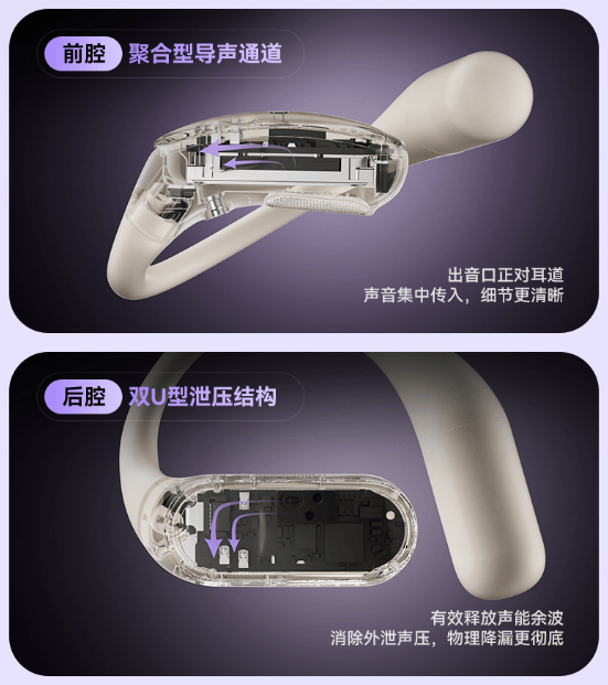 漏音是开放式耳机的另一大痛点。南卡OE Wing通过软硬件结合的方式实现突破式革新:搭载升级版DS 2.0指向性声学技术,并创新引入U型声学通道结构。前腔聚焦传音、后腔泄压降漏,从声波路径与结构工程两个维度双向抑制漏音,有效避免外泄尴尬,真正实现私密聆听体验。