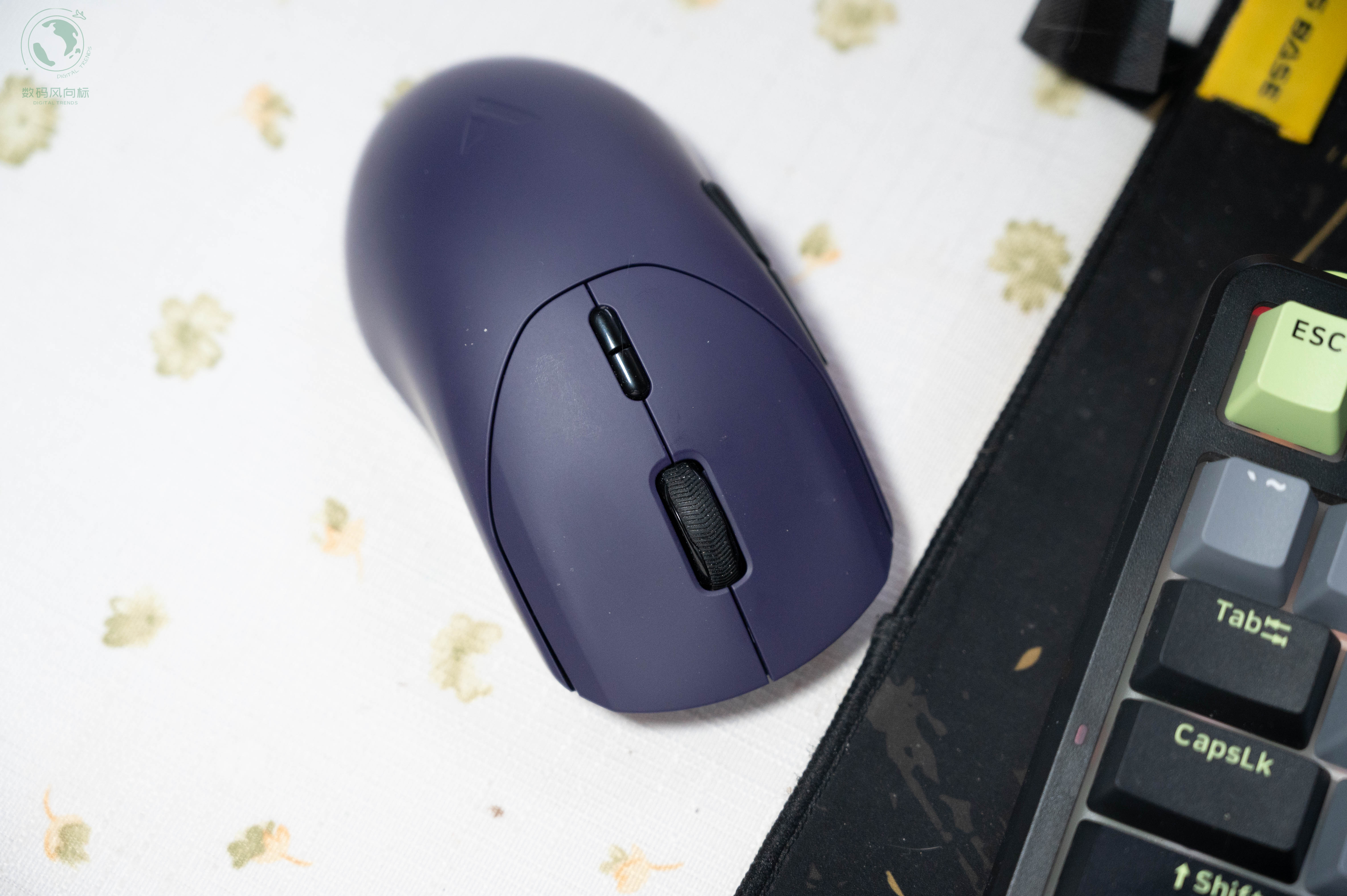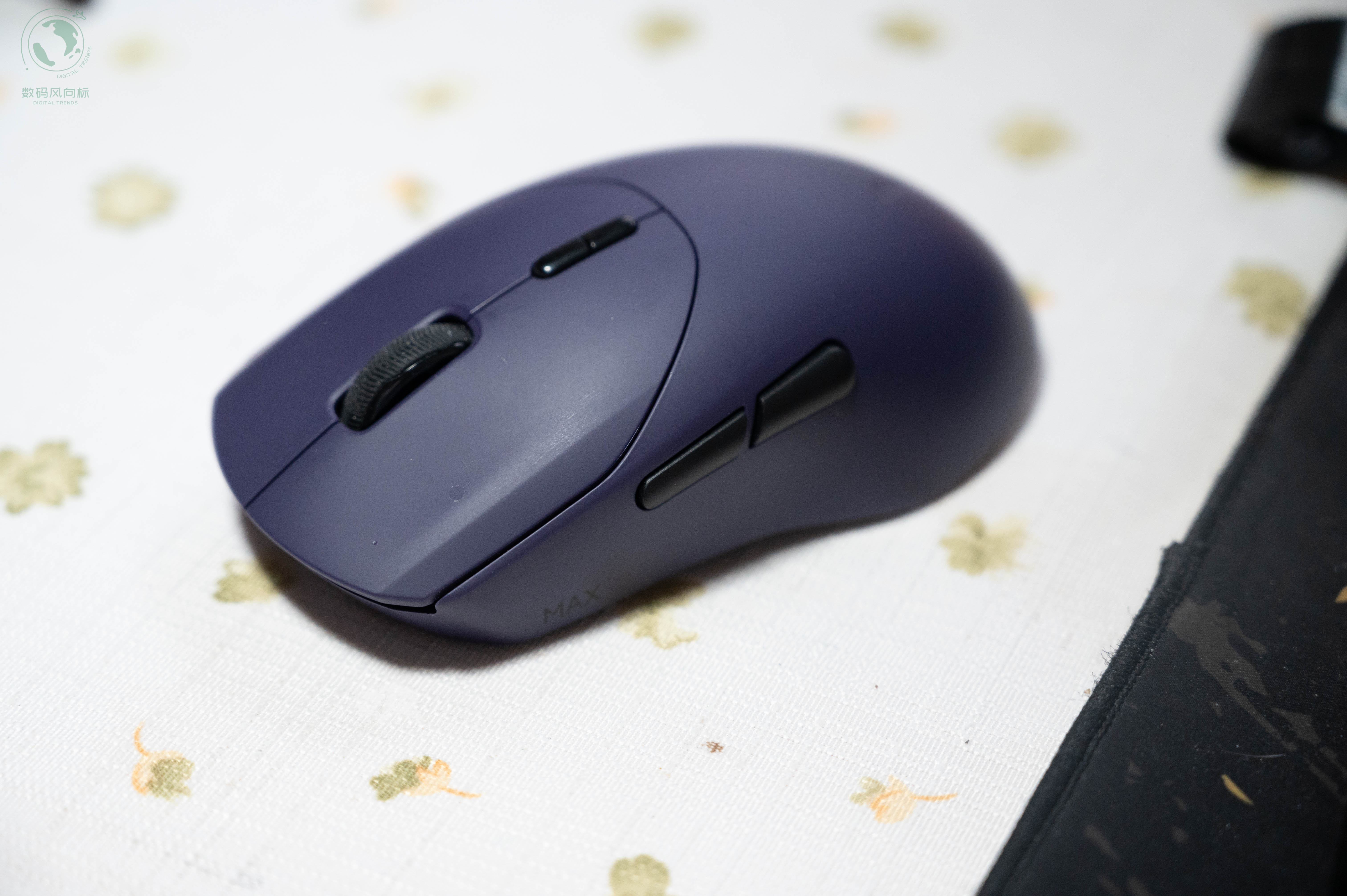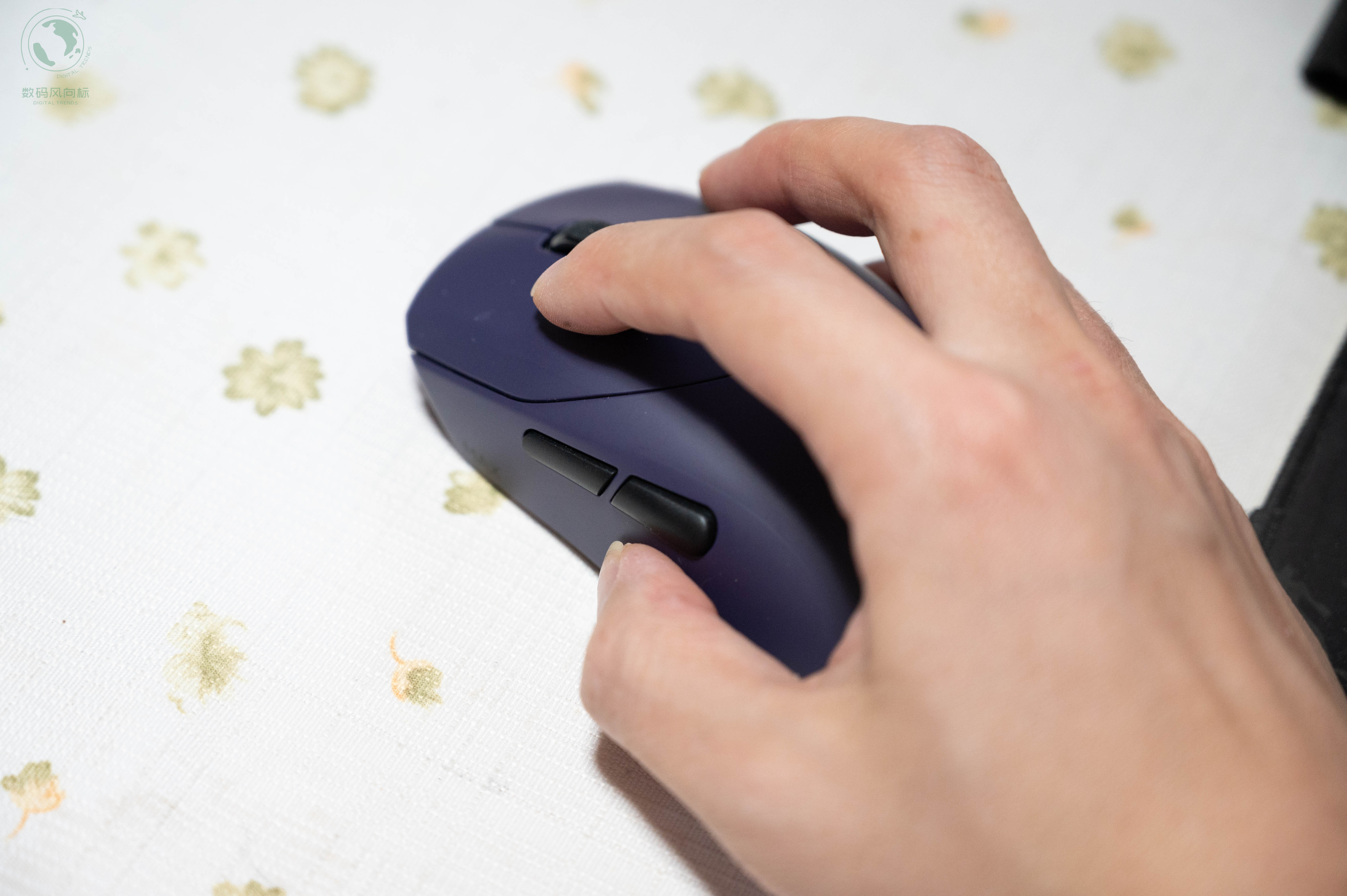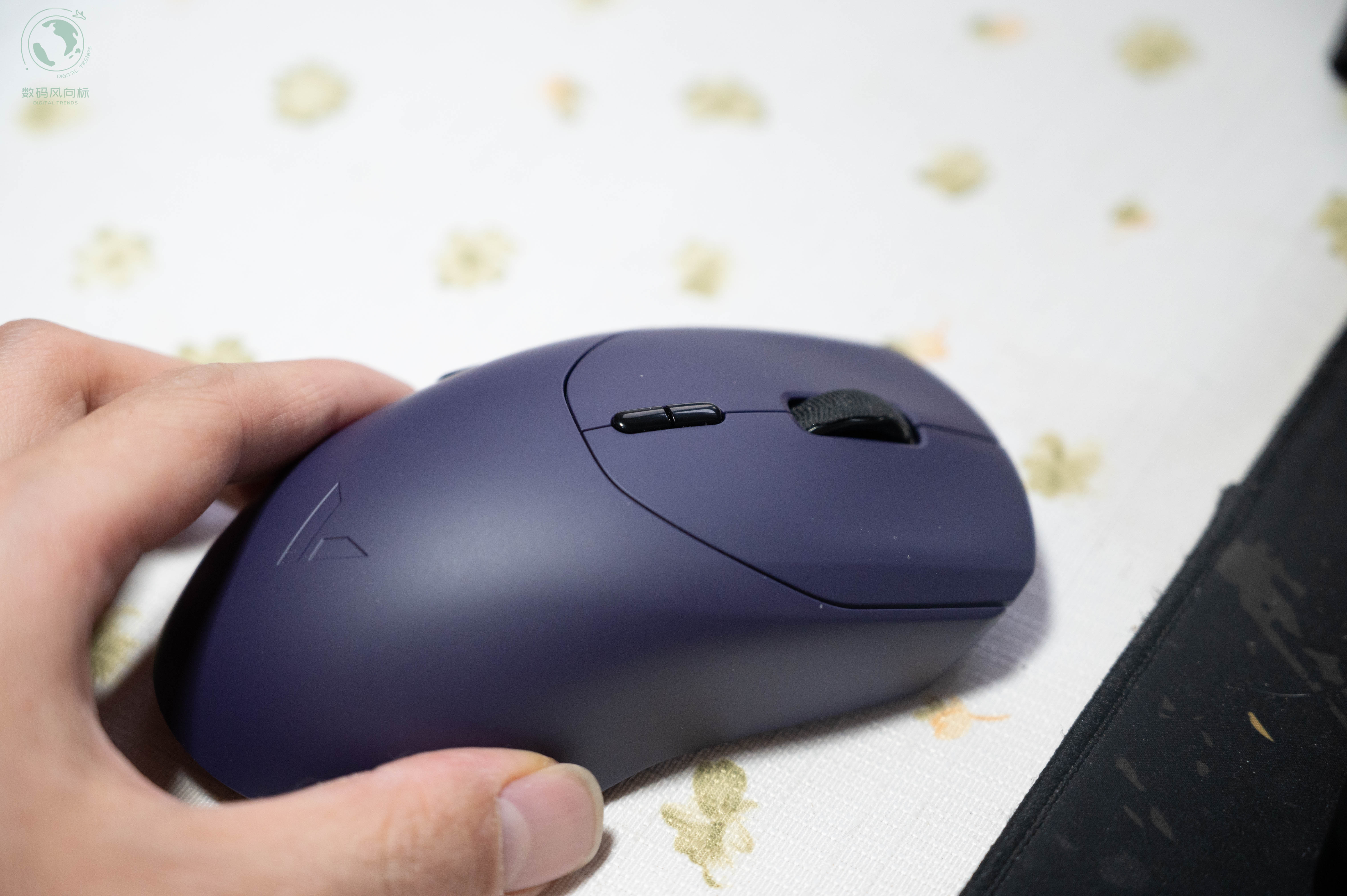 我这款是“电驭紫”配色,在一众非黑即白的鼠标中显得格外特别。表面有亲肤防滑涂层,手感细腻且吸附力强,即使手心出汗也不会打滑。鼠标采用对称设计,尺寸为125mm×65mm×39mm,对我的中等手型(约18cm)来说非常合适,无论是抓握还是趴握都能得到很好的支撑。