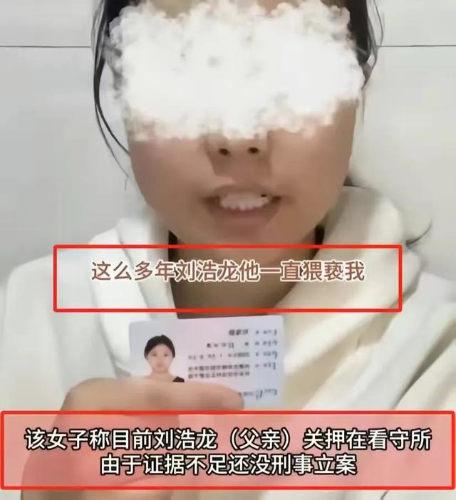 女孩在视频中称:“我要实名举报我的父亲刘浩龙,在我十二三岁的时候,刘浩龙把我给强jian了。我说我要告诉我奶奶,然后刘浩龙就威胁我说,你要敢告诉你奶奶,跟这个说,跟那个说,我就整死你。我也告诉我奶奶了,我奶奶就跟没那回事一样。这么多年刘浩龙一直十恶不赦,经常猥亵我,我希望刘浩龙死刑。在检察院刘浩龙扬言要杀人,法律是公正的,也是公平的,我相信法律能给我一个满意的答复,正义必战胜邪恶。”