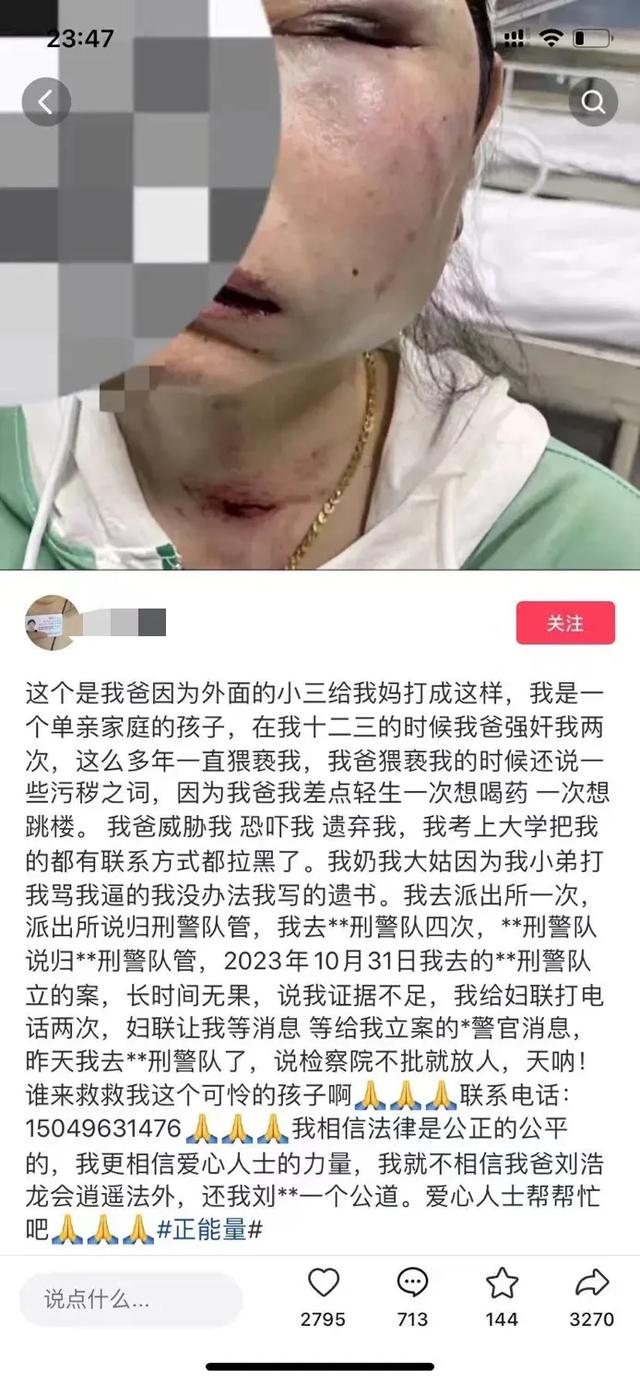 视频配图是一张她爸为了小三把她妈妈打得鼻青脸肿的照片,而且她妈妈脖子上还有一处伤口,不知道是她父亲勒的还是怎么样。