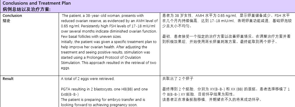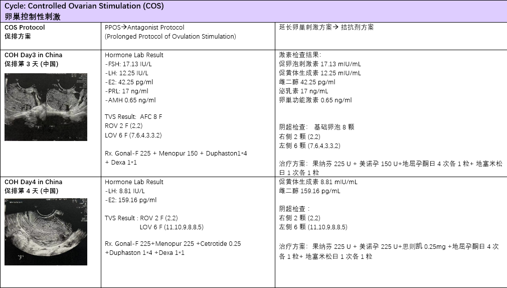 于是,女方开始了漫长而又艰辛的调理过程。每天都要按时吃好多药、打各种针,还要特别注意饮食和休息。这个过程真的很辛苦,但是为了能有一个宝宝,她从来没有抱怨过,一直咬牙坚持着。经过一段时间的精心调理,奇迹真的发生了,卵巢状况有了明显的改善。这时候,松潘医生决定开始使用延长卵巢刺激方案(拮抗剂方案)进行促排。
