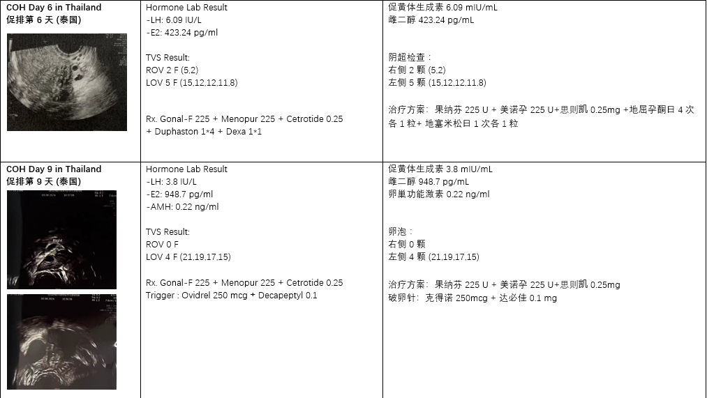 为了能得到更好的治疗效果,他们决定前往泰国继续促排。在泰国的医院里,第6天的检查结果出来了,促黄体生成素6.09mIU/mL,雌二醇423.24pg/mL,右侧卵泡2颗(5mm、2mm),左侧5颗(15mm、12mm、12mm、11mm、8mm)。看到卵泡在慢慢长大,他们的心里燃起了一丝希望。治疗方案还是果纳芬225U+美诺孕225U+思则凯0.25mg+地屈孕酮和地塞米松。
