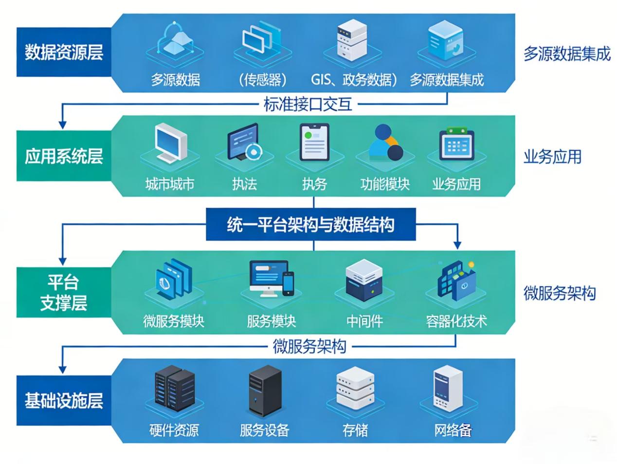 二、系统架构设计智慧城管系统采用微服务架构,基于统一的平台架构与数据结构,集成多源数据资源,提供城市管理所需的各项功能。系统分为基础设施层、平台支撑层、应用系统层和数据资源层,各层之间通过标准接口进行交互,确保系统的可扩展性和可维护性。