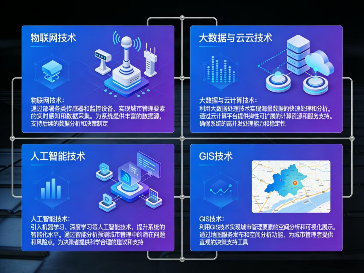 四、技术支撑1、物联网技术通过部署各类传感器和监控设备,实现城市管理要素的实时感知和数据采集。为系统提供丰富的数据源,支持后续的数据分析和决策制定。