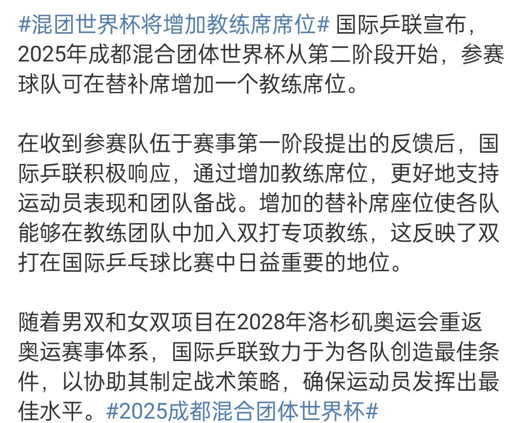 现在综合大家意见,临时修改一项规则,那就是从第二阶段开始,允许增加一个教练席位,场外最多可以三人指导,国际乒联表示此举是希望支持各个协会的备战工作,让专业的双打教练与单打区分开,同时也证明我们虚心采纳合理的意见,去快速进行整改,实现完善比赛规则的效果。