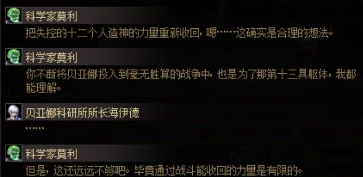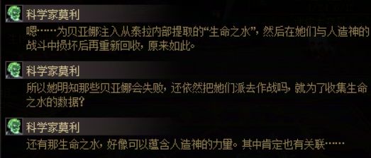最终莫利得出了结论,贝亚娜体内的生命之水能够在战斗的过程中回收人造神的一部分能量,通过这样不断地战斗就有可能将十二人造神的力量都回收到第十三具人造神的躯体中,那么就能够制造出最强的人造神!