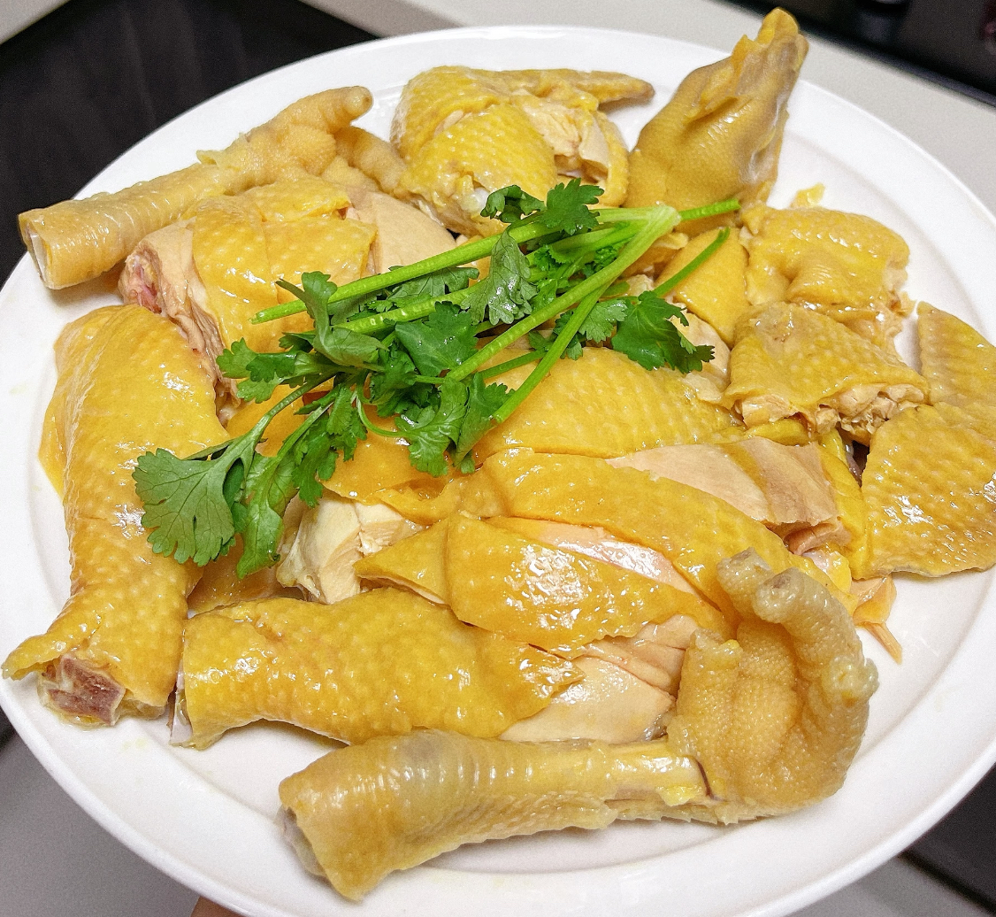 别被"白切"二字吓退,这道菜最妙的就是不用开油锅!选1.5公斤左右的三黄鸡(别问,菜场阿姨知道),掏空内脏后给鸡做个全身SPA——用盐搓遍鸡皮,再塞两片老姜进肚子。烧一锅能淹没鸡的清水,水沸后拎着鸡脖子来个"三起三落":浸入热水5秒提起,重复三次。这招能让鸡皮瞬间收缩,煮出来油亮弹牙,堪称"鸡皮紧致术"。