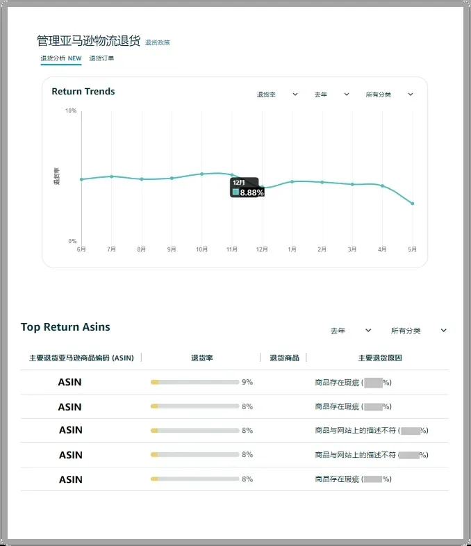 短期与长期退货率对比:分别统计过去3个月和12个月的退货率,帮助卖家分析趋势;