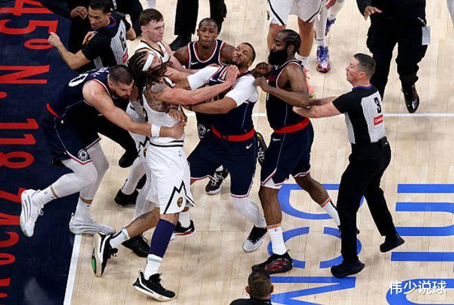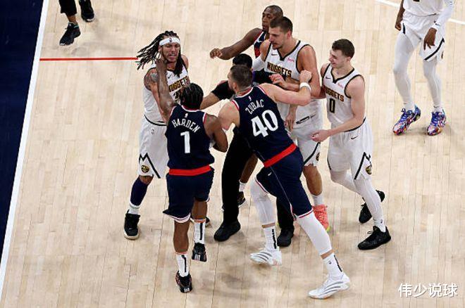 北京时间4月27日,在洛杉矶快船和丹佛掘金的G4比赛中,双方在第二节最后阶段爆发大冲突。不过裁判没有驱逐任何球员,只是吹了6个技术犯规:哈登、鲍威尔、邓恩、约基奇、戈登、布劳恩,两队各三人相互抵消。