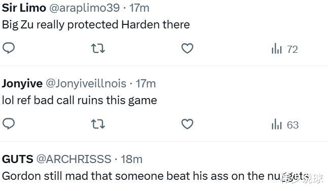 “哈哈,裁判的判罚毁了这场比赛”。“戈登还在为掘金队被人打得屁滚尿流而生气”。
