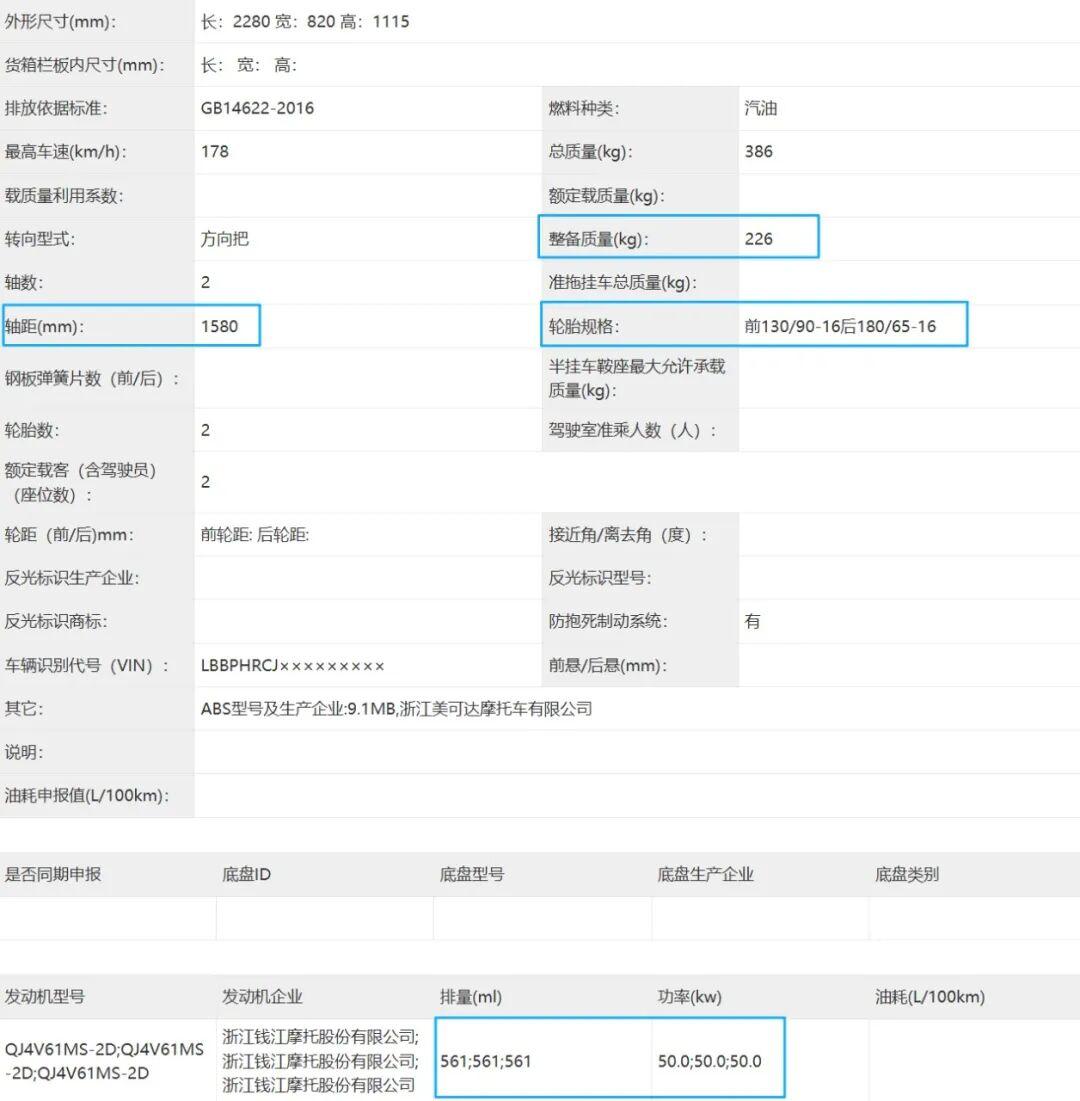 动力上依旧搭载那台V型四缸水冷引擎,实际排量561cc,最大功率50kW/10,500rpm,最大扭矩54Nm/9,000rpm,标配滑动离合并且还有AMT手自一体变速箱。整备质量上从221kg提升至226kg,轴距依旧保持1,580mm。其他配置上应该也会与老款保持一致,所以最大的亮点依旧集中在外观升级。